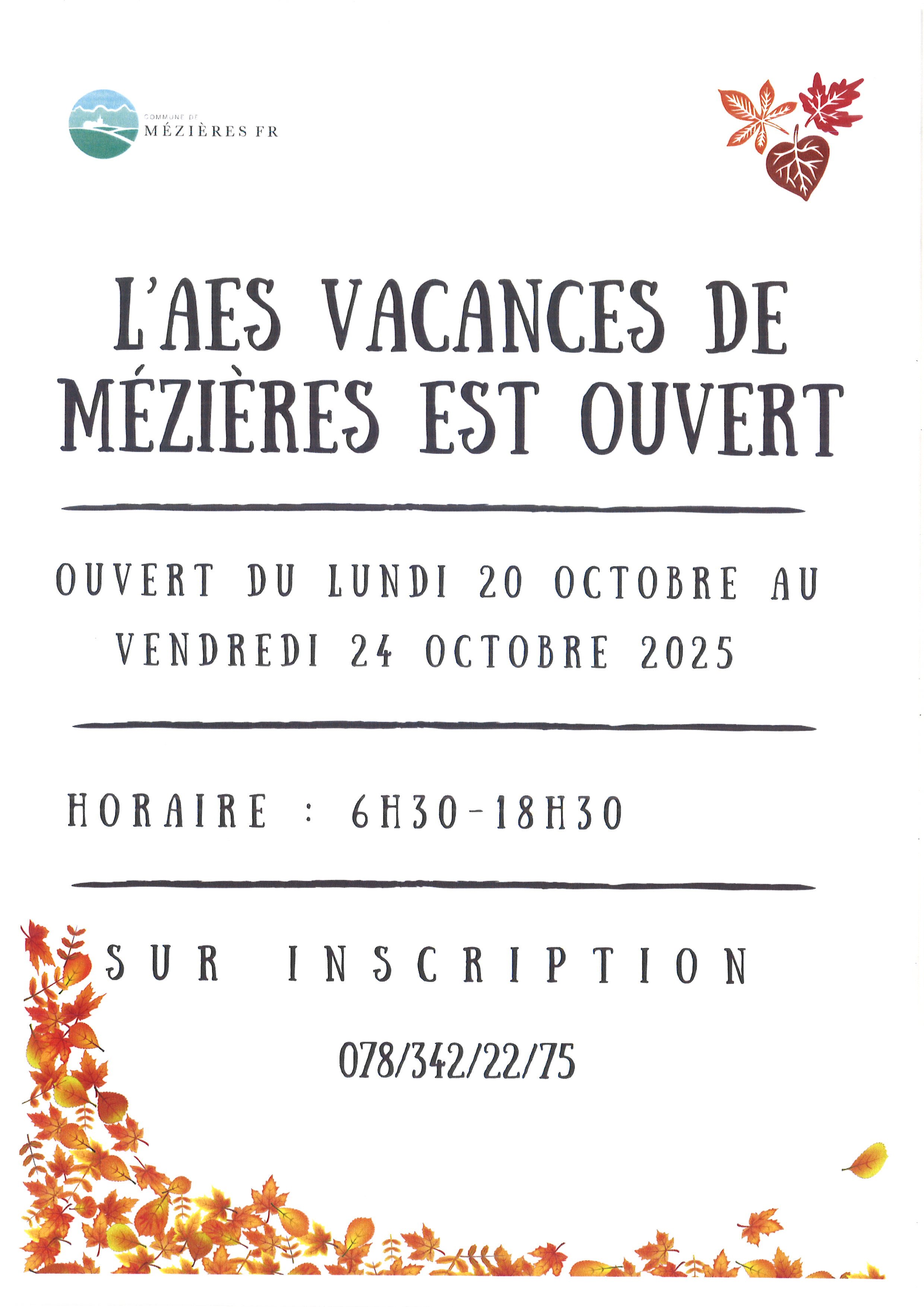 Vacances automne 2025 L'AES de Mézières sera ouvert la semaine du 20 au 24 octobre 2025 (voir plus bas).